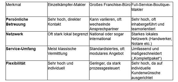 Neben diesen fachlichen Aspekten ist auch die persönliche Chemie entscheidend. Sie werden über mehrere Monate eng mit diesem Menschen zusammenarbeiten. Vertrauen und eine offene, ehrliche Kommunikation sind daher unerlässlich. Eine nützliche Orientierung kann auch die Art des Maklerbüros bieten. Die folgende Tabelle zeigt eine vereinfachte Gegenüberstellung verschiedener Typen: