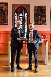 Bildquelle(n): Von links: Dr. Matthias Everding, Vorstandsvorsitzender Sparkasse Nürnberg, übergibt den symbolischen Schlüssel an seinen Nachfolger Matthias Wittmann, derzeit Firmenkundenvorstand und ab 1. Januar 2026 Vorsitzender der Sparkasse Nürnberg.