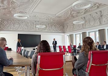 Die Veranstaltung begann mit einer exklusiven Führung durch das Gebäude. Astrid Gieron Gost, Projektmanagerin Sparkasse Nürnberg, und Julia Lechner, Leiterin des ImmobilienCenters der Sparkasse Nürnberg, zeigten den Gästen die einzigartigen, neuen Räumlichkeiten und gaben Einblicke in die verschiedenen Arbeitsbereiche und das neue New Work-Konzept. Im historischen Brentano-Saal ging es anschließend bei einem gemeinsamen Mittagessen in die nächste Etappe der Veranstaltung. Das hauseigene Catering des Betriebsrestaurants „achtzehn21“ verwöhnte die Gäste mit einer Auswahl an Snacks und Süßspeisen. Dabei bot der Mittagstisch reichlich Gelegenheit zum traditionellen Austausch und Netzwerken in angenehmer Atmosphäre. Der krönende Abschluss des Treffens war dann der Besuch der hauseigenen Dachterrasse mit einem atemberaubenden Blick auf die Nürnberger Altstadt und die Burg – ein Moment, der den besonderen Rahmen der Veranstaltung noch einmal unterstrich.