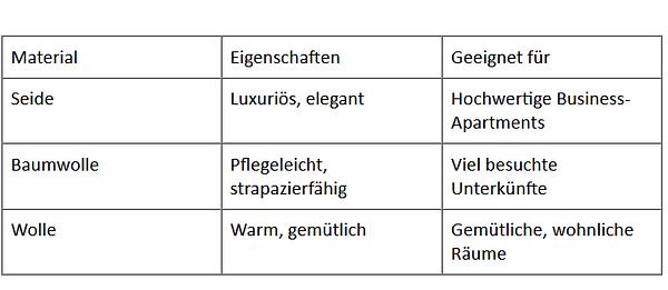 Textilien spielen eine entscheidende Rolle in der Gestaltung von Innenräumen. Sie verleihen einem Raum nicht nur Farbe und Struktur, sondern beeinflussen auch die Akustik und das Raumklima. In Business-Apartments, wo oft ein minimalistischer und funktionaler Stil vorherrscht, können Textilien wie Vorhänge, Teppiche und Bettläufer den entscheidenden Unterschied machen.